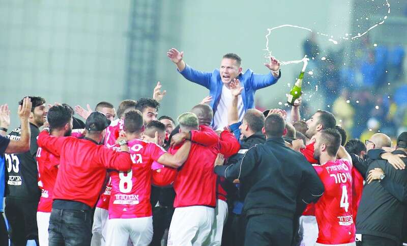 ברק בכר חוגג על כתפיו של השחקנים את האליפות השניה ברציפות // צילום: אלן שיבר