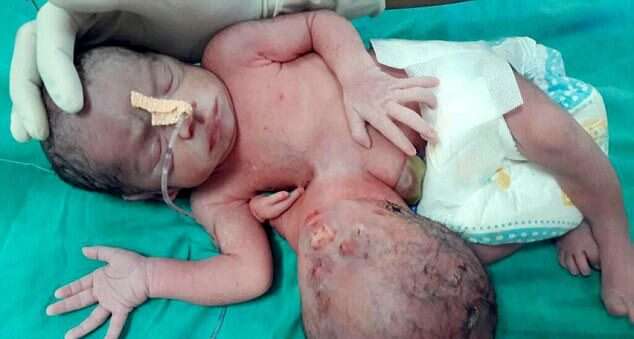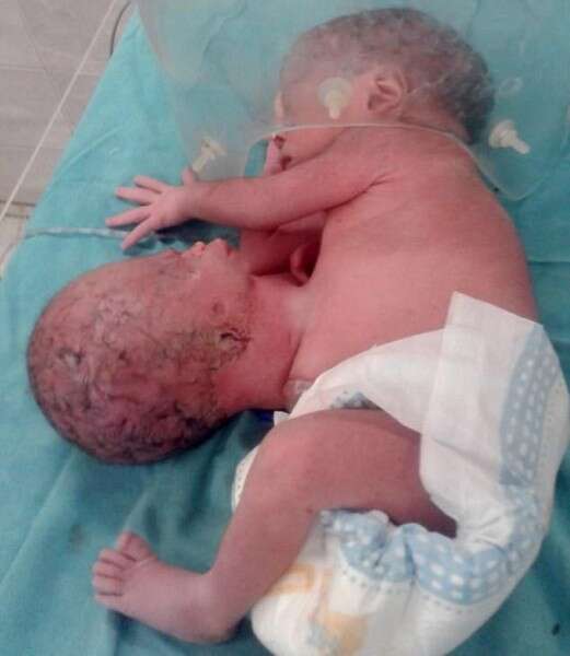 הרופאים נדהמו לראות שהתינוקת נולדה עם ראש נוסף - כולל עיניים, אוזניים, אף, שפתיים ויד שמאלית פגומה שתלויה על חזה.