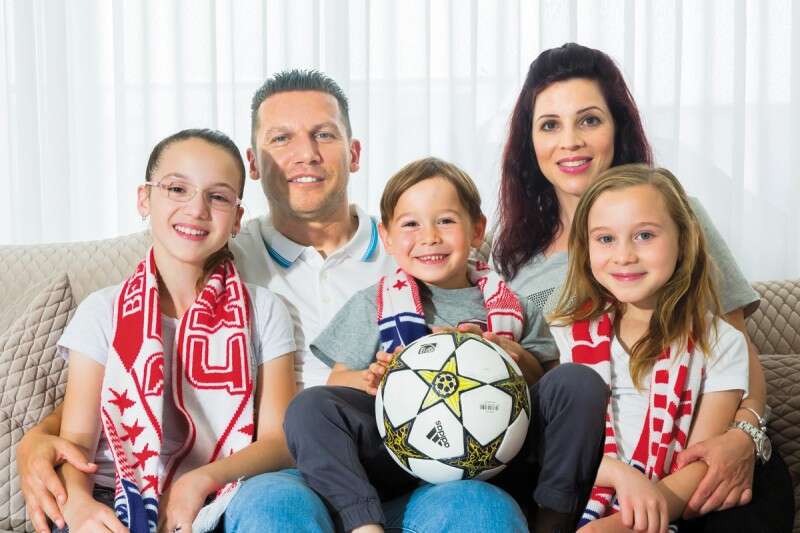 משפחת בכר בהרכב מלא - רותם, אורלי, ליאם, ברק ומילי. "בבתי הספר שלהם יש הרבה אוהדים של קבוצות אחרות, וכשבאר שבע מפסידה זה לא נעים" // צילום: יהושע יוסף