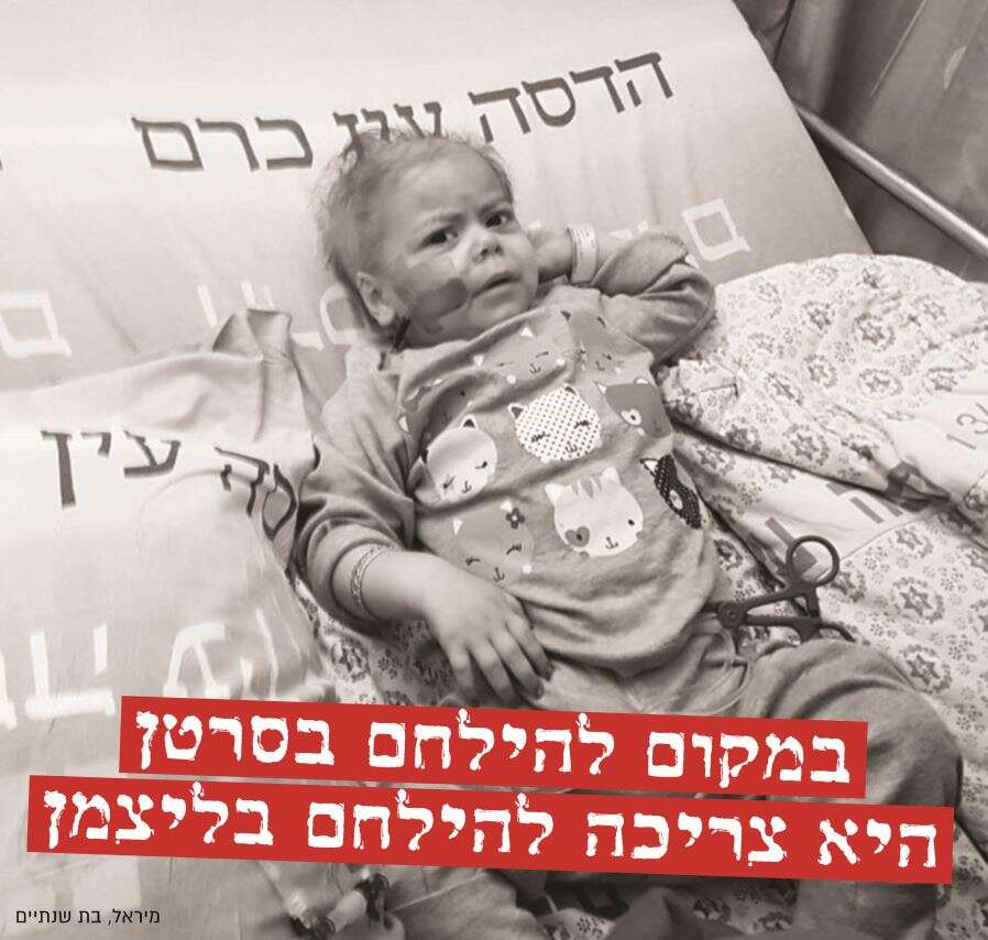 במודעה שהופצה אתמול (ראשון) נראית מיראל הפעוטה שוכבת במיטת בית החולים תחת הכיתוב "במקום להילחם בסרטן היא צריכה להילחם בליצמן". במודעה נכתב עוד "ילדינו נדונו למוות. בית החולים הדסה בהנהלת פרופ' רוטשטיין מעדיף לקבל כספים של תיירי מרפא מחו"ל על פני חיי ילדינו וכל זאת בגיבוי שר הבריאות ליצמן".