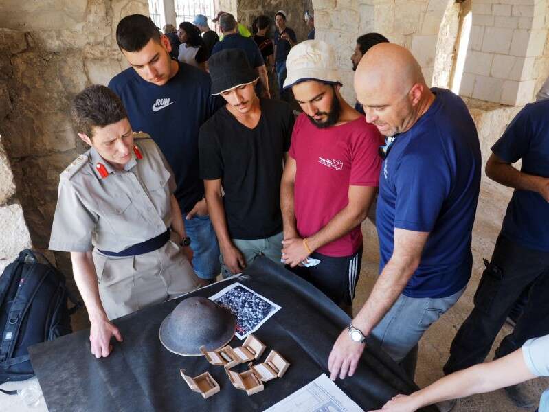 חניכי מכינת "מלח הארץ" ונציגי רשות העתיקות מציגים את הממצאים שחשפו בפני הנספחת הצבאית בשגרירות בריטניה בישראל, קולונל רוני ווסטרמן // צילום: אסף פרץ, רשות העתיקות