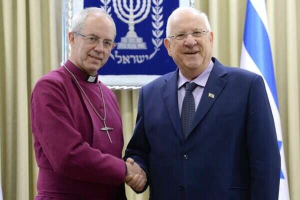 הנשיא ראובן (רובי) ריבלין נפגש היום (שלישי) בבית הנשיא עם הארכיבישוף ה-105 של קנטרברי, ג׳סטין וולבי, שהגיע לביקורו הרשמי הראשון בישראל. בפגישה עם הארכיבישוף, הנושא במשרת הכמורה הבכירה בכנסייה האנגליקנית, השתתפו גם שגריר בריטניה בישראל, דיוויד קוורי, הארכיבישוף האנגליקני של ירושלים, סוהיל דואני, ודיקן קתדרלת סיינט ג'ורג' בירושלים חוסאם נאום.