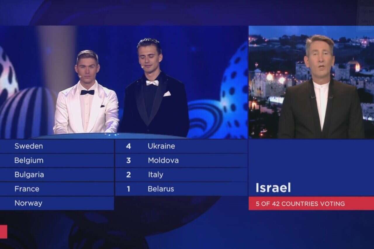 המנחים עברו בשידור חי לישראל ולעופר נחשון על מנת לקבל את הניקוד שתעניק ישראל למדינות המשתתפות. נחשון ביקש להגיד כמה מילות פרידה בשל הסגירה של רשות השידור, וכאמור, הצליח לבלבל ולהותיר בשוק את כלי התקשורת הבריטים. "ב-44 השנים האחרונות ישראל השתתפה באירוויזיון מהפלטפורמה הזאת וניצחה שלוש פעמים עם 'אבניבי', 'הללויה' ו-'דיווה'. אבל הערב הוא הערב האחרון שלנו, בקרוב רשות השידור תסיים את שידוריה. אני מבקש לומר תודה אירופה, על כל רגעי הקסם והזמנים הנפלאים", אמר נחשון למנחים בקייב.