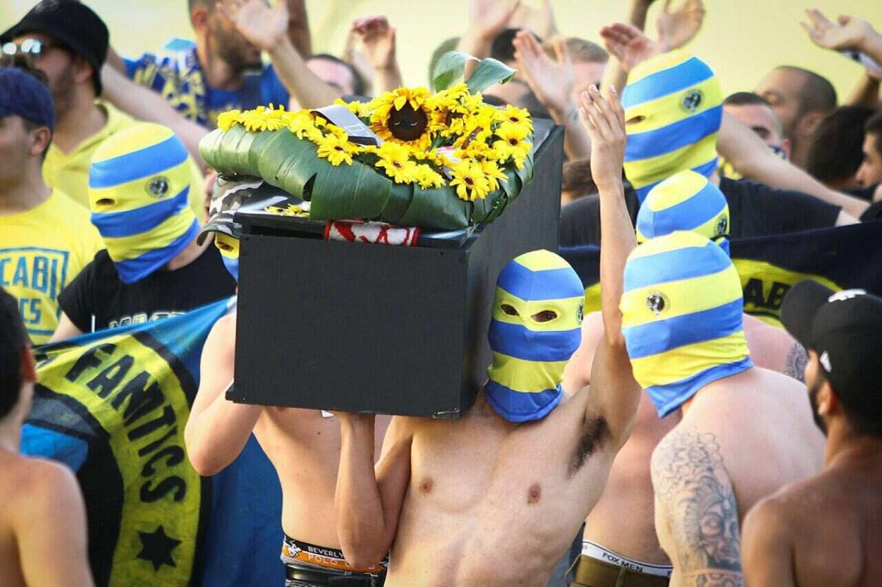 לאחר שקומץ אוהדים בצהוב נפגשו אמש באופן ספונטני בכיכר רבין וחגגו את ירידתה של היריבה העירונית לליגת המשנה, החגיגות הערב (א') המשיכו לפני המשחק של מכבי ת"א נגד מכבי פתח תקווה במסגרת המחזור ה-35 של ליגת העל כאשר האוהדים מארגון ה"פנטיקס" המזוהה עם מכבי ת"א לקחו את עניין השמחה לאיד צעד אחד רחוק מדי. אוהדים שהיו ברובם, רעולי פנים הכינו דמוי ארון המכוסה בדגלים של הפועל ת"א וביצעו תהלוכה לארון הקבורה.