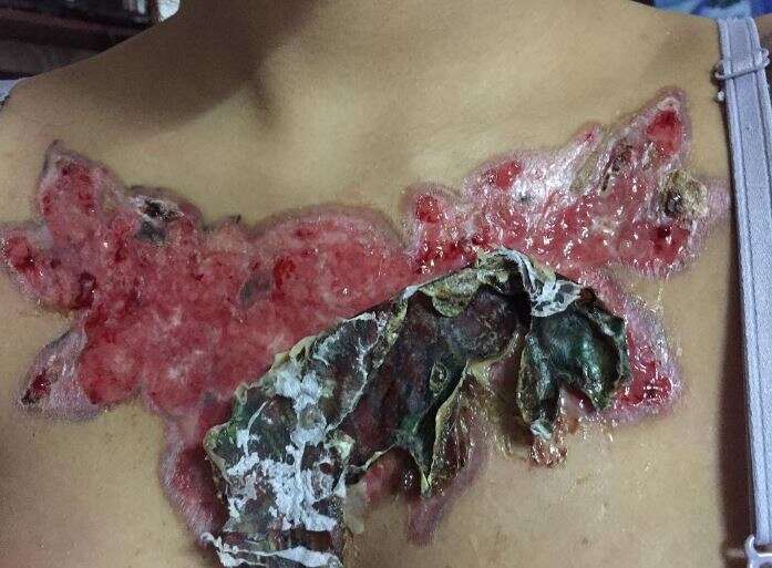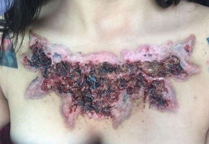אלא שיחד עם הקעקוע, החלה להתקלף גם שכבה מעורה של הנערה, שהותירה צלקת הנראית כמו כוויה עצומה על החזה שלה. ריאו מרחה את המשחה כבר בחודש פברואר האחרון, ותוך כמה שבועות התקלף הקעקוע לחלוטין, ובמהרה הופיעה הצלקת הקשה על גופה.