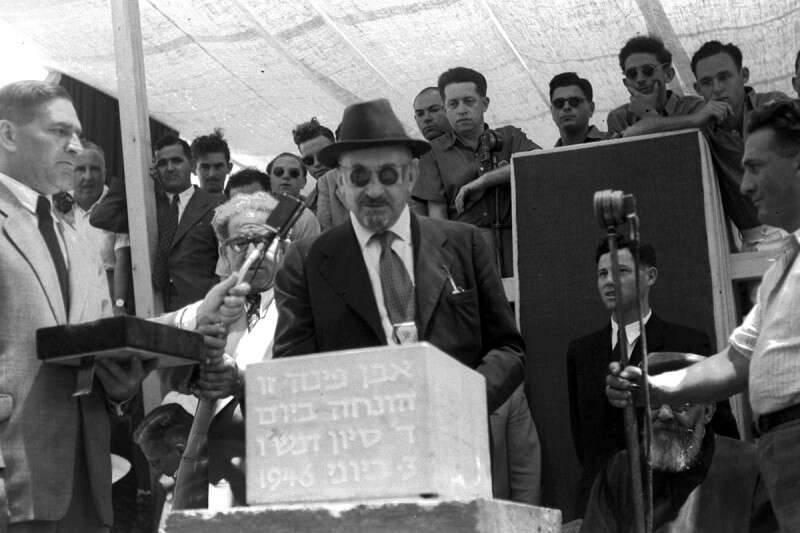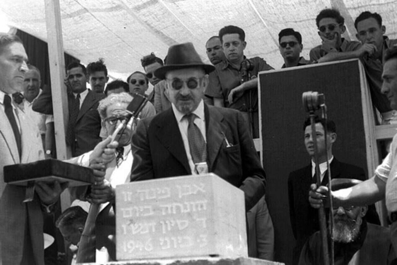 בתמונה: נואם בטקס הנחת אבן הפינה למכון ויצמן ברחובות, יוני 1946