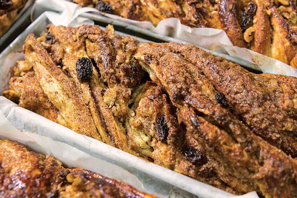 עוגת שמרים המכילה קינמון, צימוקים בהירים ושני סוגי אגוזים: אגוזי מלך ואגוזי לוז, המשדרגים את טעמה הסופי. לגיוון, אפשר להוסיף למלית 2 כפות קקאו יחד עם הקינמון.