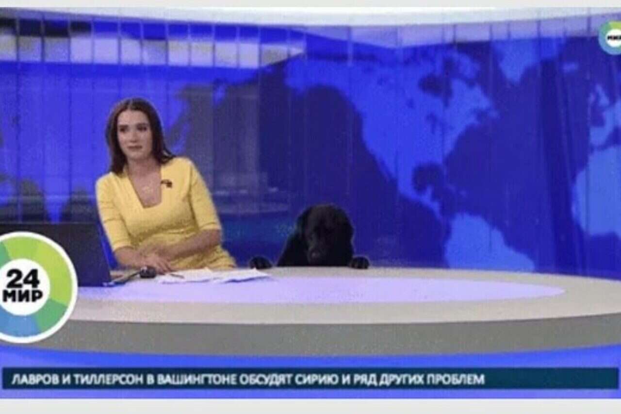 מגישת חדשות בערוץ הרוסי Mir24 אירחה במהדורה אורח לא צפוי מבחינתה. בעוד היא מקריאה את כותרות היום, הגיח לפתע כלב שחור גדול אל הסט והסיט את תשומת ליבה של המגישה המופתעת.