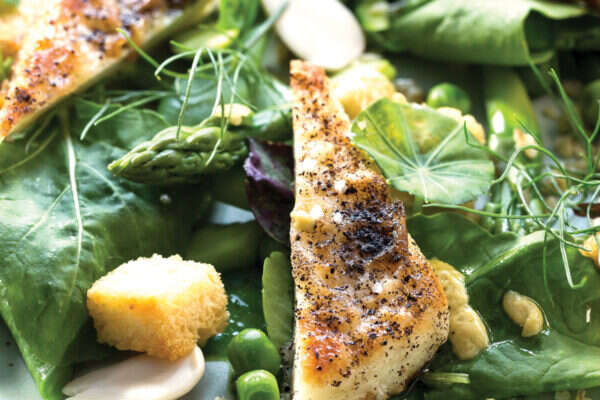 במקביל מחממים מחבת טפלון. מקמחים את פרוסות החלומי, מנערים ומטגנים בשמן הזית ועלי המרווה עד להזהבה. מספיגים, מאבקים באבקת הלימון הפרסי ומניחים על הירוקים. מפזרים את הקרוטונים ומגישים מיד.