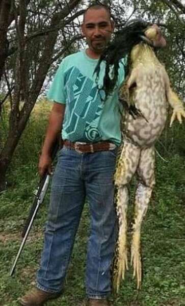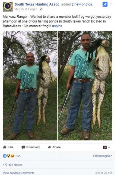 אל תרגיזו את תושבי טקסס! בחור בשם מרקוז רנגל טוען כי הוא הצליח לצוד את החיה "צפרדע-שור" (bull frog) במשקל של לא פחות משישה קילוגרמים. רנגל שיתף בדף הפייסבוק שלו תמונות יחד עם החיה המתה, אותה לטענתו צד בעיירה בטסביל (Batesville) שבטקסס.