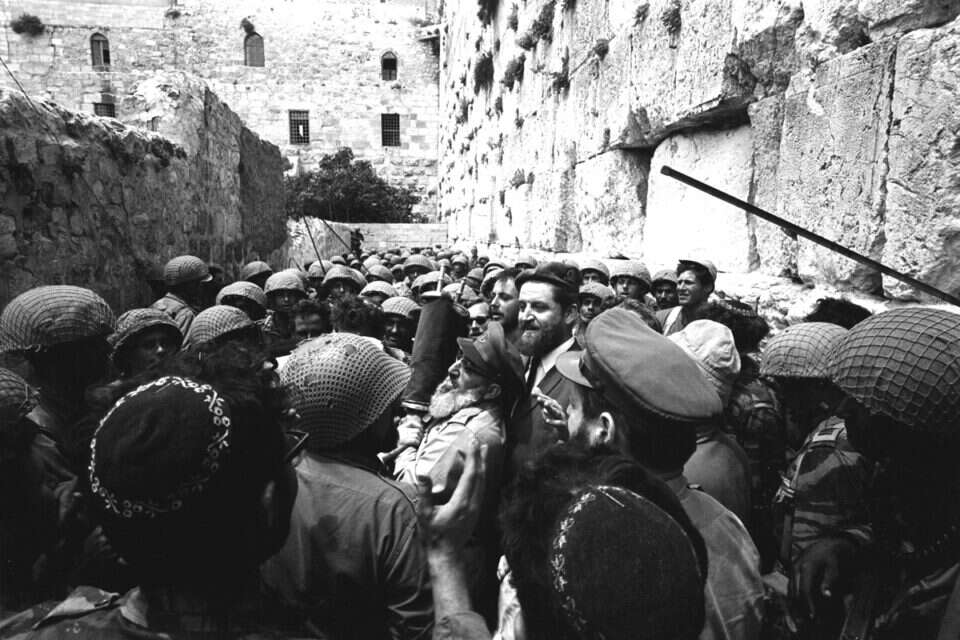 הרב שלמה גורן (במרכז) מוקף בלוחמים לאחר שחרור הכותל, צילום: באדיבות ארכיון צה"ל במשרד הביטחון/מיכה בר־עם מערכת "במחנה"