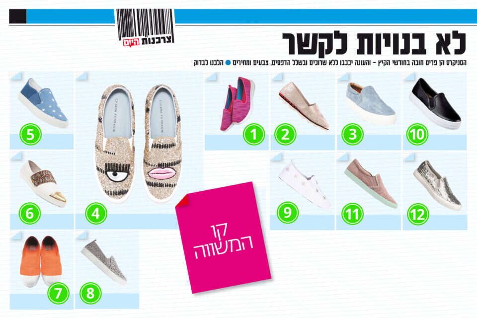 לפני כשנתיים בערך השתלטו ה"סטן סמיט" של אדידס על כפות הרגליים של סלבריטאיות ארצנו, שהגיעו לשלל פתיחות והשקות כשהן נועלות את הסניקרס הלבנות - והמגיפה החלה. גם הקיץ יככב טרנד הסניקרס, והפעם בגרסה משודרגת - ללא שרוכים, בשלל צבעים ודגמים, ובמראה קז'ואלי וקליל.