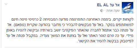התגובה הרשמית של חברת אל על // צילום מסך פייסבוק