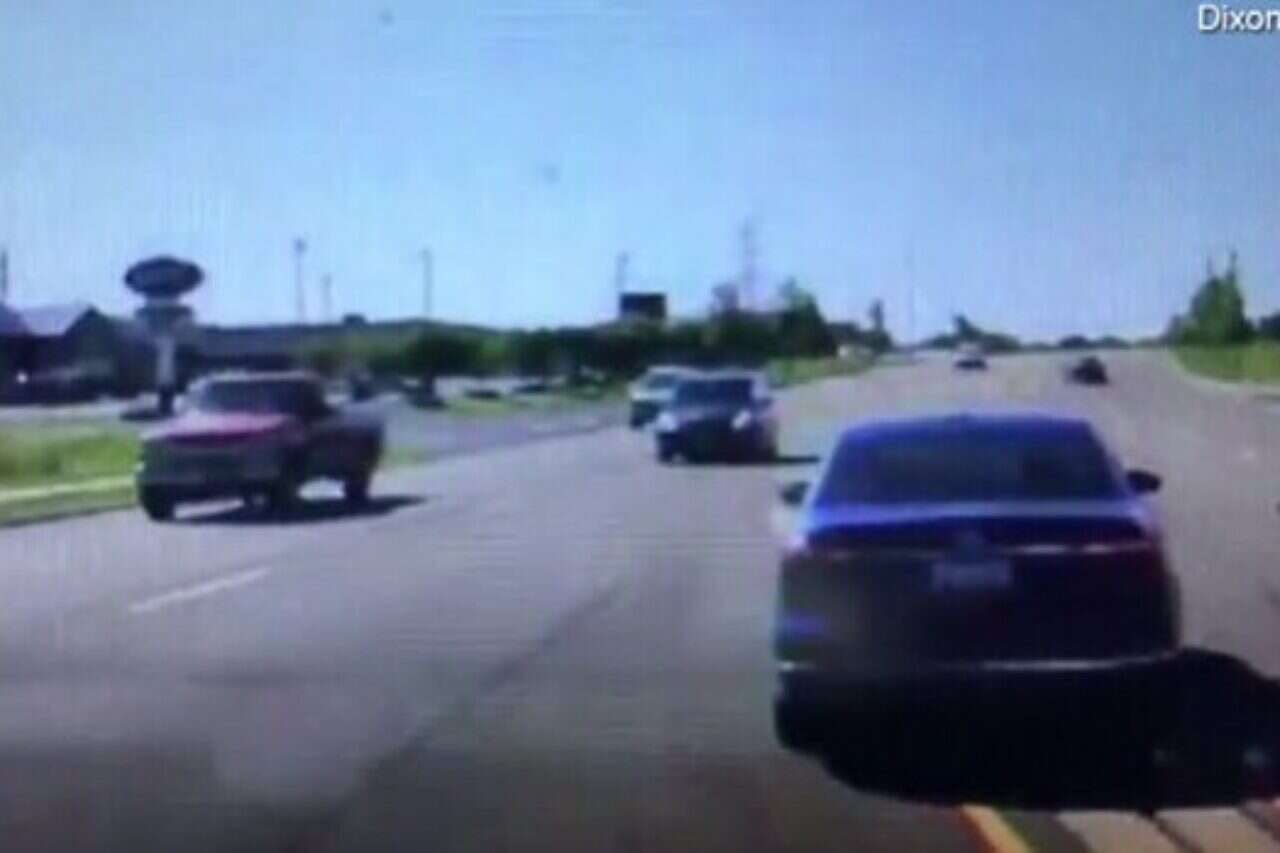 תצלומים שנקלטו במצלמת רכב של משטרת מחוז דיקסון תיעדו את הרגעים בהם מכונית חוצה אור אדום במהירות נמוכה ונכנסת אל התנועה המגיעה ממול.