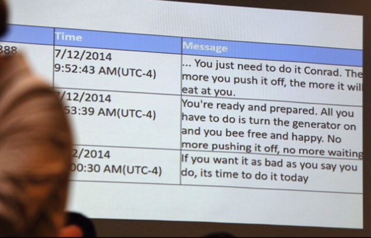 מישל קרטר בת ה-20 ממסצ'וסטס, ארצות הברית, מואשמת כי עודדה את בן זוגה קונרד רוי להתאבד. קונרד נמצא מת לאחר ששאף גז במכוניתו ביולי 2014. באותה העת רוי היה בן 18 ואילו קרטר הייתה בת 17. מדובר באחד המשפטים המדוברים במדינה כבר מספר שנים, כיוון שלא מדובר במשפט רצח אלא במשפט על הדחה להתאבדות, נושא אפור שהחוק בעניינו לא ברור.