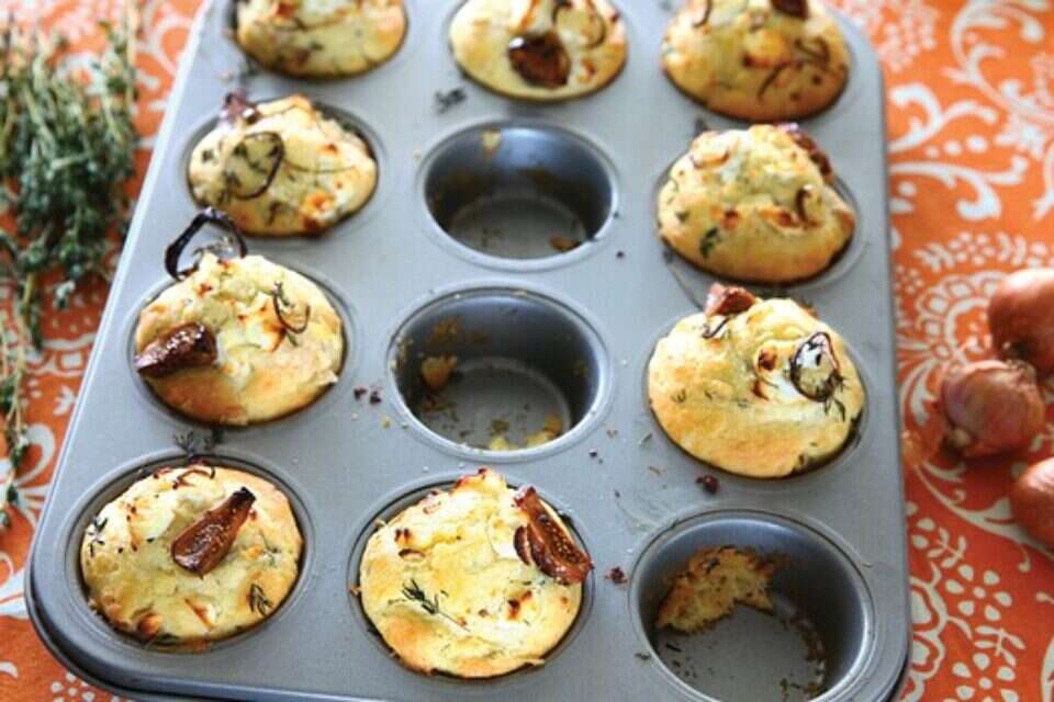 5. מניחים פרוסת גבינת עזים על פני המאפינס ומפזרים צנוברים.