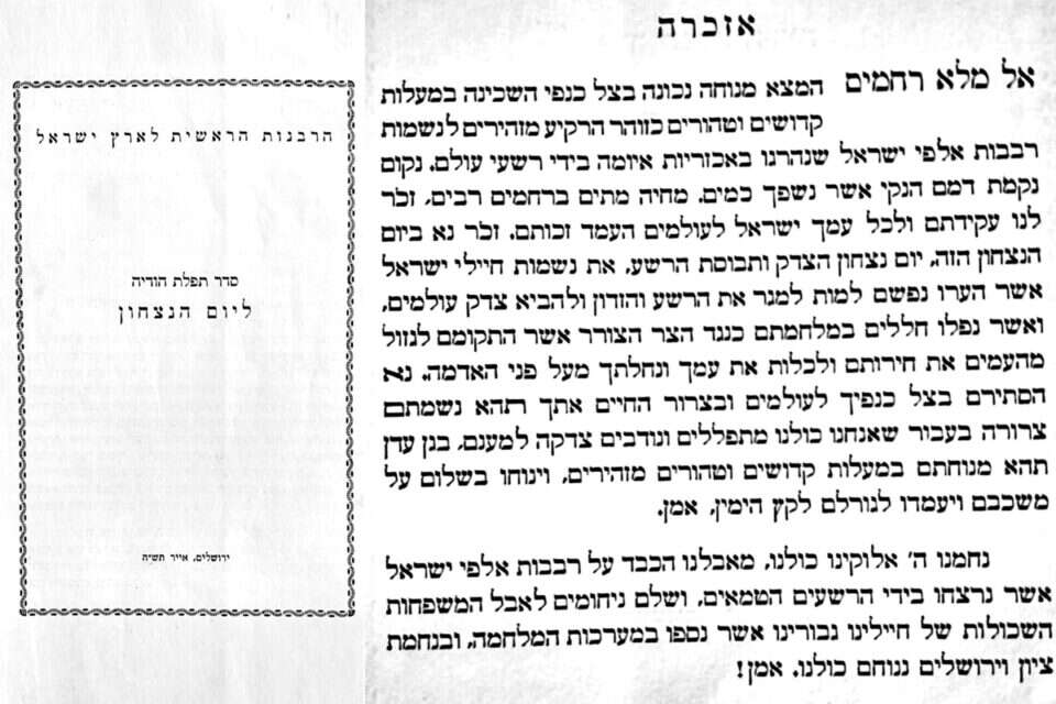 בבית המכירות "ירושלים של זהב" ציינו כי "נוסח האזכרה הוא ייחודי, מעניין ואינו מוכר". באזכרה הייחודית נכתב: "אל מלא רחמים, המצא מנוחה נכונה בצל כנפי השכינה במעלות קדושים וטהורים כזוהר הרקיע מזהירים לנשמות רבבות אלפי ישראל, שנהרגו באכזריות איומה בידי רשעי עולם. נקום נקמת דמם הנקי אשר נשפך כמים". לאחר מכן מודפס נוסח ארוך ומרגש של ברכת הודיה ליום הניצחון על הנאצים: "ביום זה, יום ניצחונם המזהיר של ממלכות הברית נגד כוחות החושך והעריצות... ואתה בעוז גבורתך אימצת את רוחם וכוחם של צבאותיך חילות ממלכת בריטניה הגדולה ובנות בריתה: ממשלת ארה"ב הנישאה ומדינת הסובייטים האדירה, שבמערכותיהם נמצאים חלוצי גיבורי עמך ישראל, שהתגייסו למלחמה נגד אלה אשר חירפו שמך ותורתך ולנקום נקמת דם עמך השפוך. ברוך אתה ה' אלוקינו מלך השופט את עולמו בשלום וצדקה