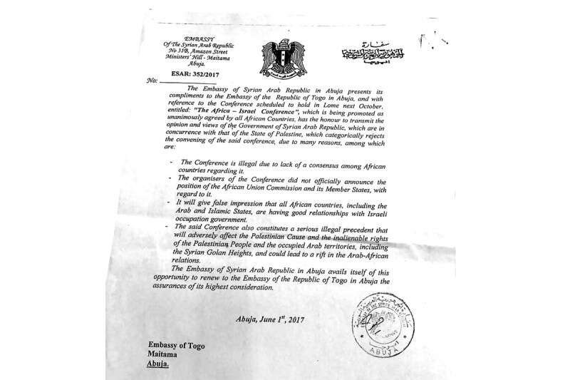 במסמך שהעבירה שגרירות סוריה בניגריה לשגרירות טוגו במדינה ב־01.06.17, הביעו הסורים את מחאתם הרשמית. לדבריהם, המהלך המתוכנן "יגרום לפגיעה בסוגיה הפלשתינית ולהמשך השליטה של ממשלת הכיבוש הישראלית באדמות פלשתיניות ובגולן הסורי הכבוש".