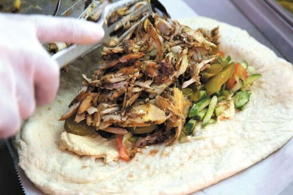 סבינה הזמינה לאפה ללא חומוס, עתירת חריף וטחינה וסלט כרוב מרענן, ואילו אני חשבתי שהחומוס עשוי להתאים נוסף על הממרח החריף, הכרוב והטחינה, כמובן. אל תוך הלאפה הרכה והריחנית התווספו כמות נדיבה של גילופי שווארמה ושפע עשבי תיבול קצוצים, וזאת גולגלה ביד מיומנת לכדי גליל מהודק ונאה.