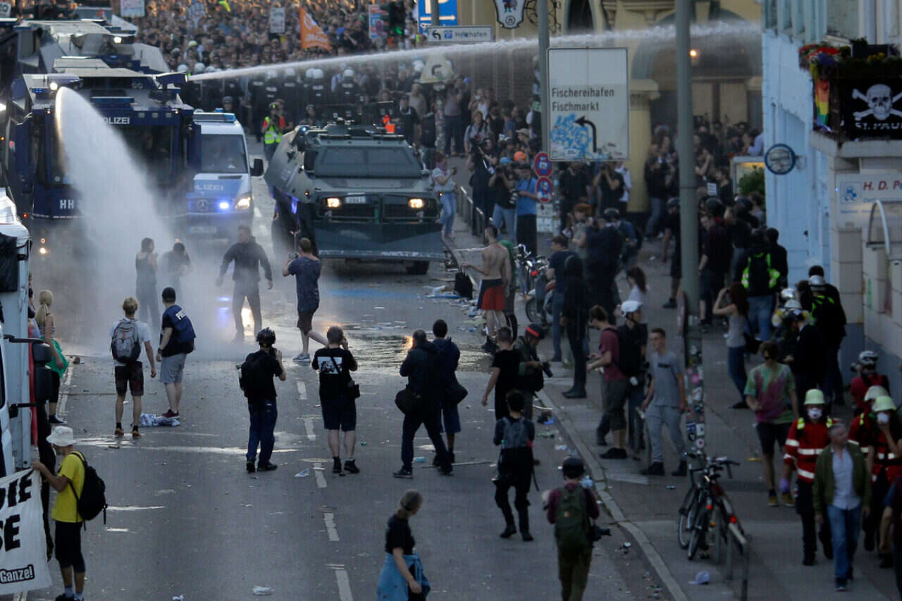 אלפים מפגינים הערב (חמישי) בהמבורג, בהפגנות שגלשו גם לאלימות. לאחר שקבוצה של מפגינים החלה לזרוק בקבוקים וחפצים אחרים על השוטרים, הם השתמשו בזרנוקי מים ובגז מדמיע כדי לפזרם.
