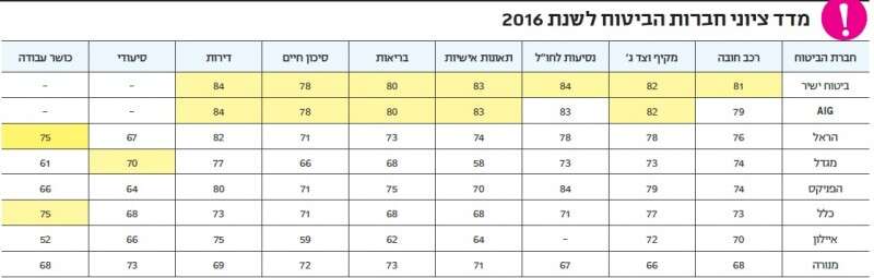 החברות שהגיעו למקומות הראשונים בכל מוצר ביטוח הן: ביטוח רכב חובה - שירביט, ביטוח ישיר ו־AIG; ביטוח רכב רכוש (נזק עצמי וצד ג') - AIG ביטוח ישיר ושירביט; ביטוח דירה ותכולתה – שומרה, AIG וביטוח ישיר; ביטוח בריאות (ניתוחים, השתלות, תרופות ומחלות קשות) - ביטוח ישיר, AIG והפניקס; ביטוח תאונות אישיות (תאונות אישיות, נכויות) - ביטוח ישיר, AIG והראל; ביטוח סיעודי (פרטי) - מנורה, מגדל וכלל; ביטוח נסיעות לחו"ל - הפניקס, ביטוח ישיר ו־AIG; ביטוח אובדן כושר עבודה - הראל, כלל ומנורה; ביטוח סיכון חיים - ביטוח ישיר, AIG ומנורה.