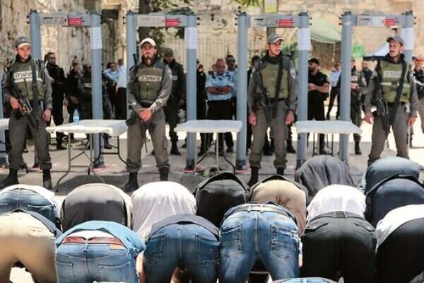 הפגנת ריבונות שמנעה שחזור של אירועי כנסיית המולד במבצע חומת מגן. תפילה של מוסלמים מול המגנומטרים בכניסה להר הבית, השבוע // צילום: אורן בן חקון
