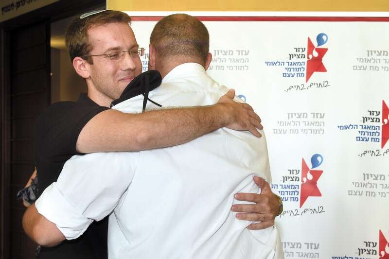אריה איזנמן מחבק את רס"ן ליאור (בגבו למצלמה). "לאורך כל הדרך אמרו לנו שהשתלה זה מסוכן"