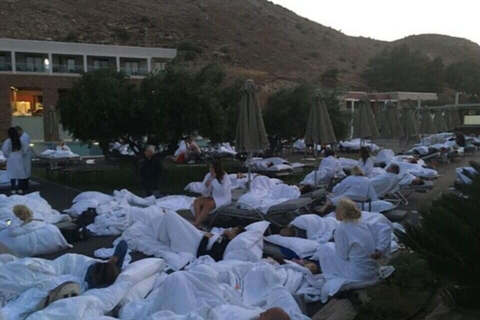 אסף סיפר כי הוא ואשתו ישנו תחת כיפת השמיים יחד עם מאה ישראלים ותיירים ממדינות שונות: "כולנו עלינו למדשאה העליונה כדי להיות תחת כיפת השמיים ולהעביר שם את הלילה. רעידות המשנה טרם חדלו ועדיין מורגשות לפעמים ממש חזק. לא מאשרים לנו להיכנס למבנים של המלון עד שיגיע מהנדס מטעמם ויבדוק את מצבם של המבנים. עד אז הרבה מאיתנו זרוקים על מזרונים בחוץ. יאמר לזכות המלון כי הם ממשיכים לתפקד בצורה יעילה ואף הגישו לנו ארוחת בוקר".
