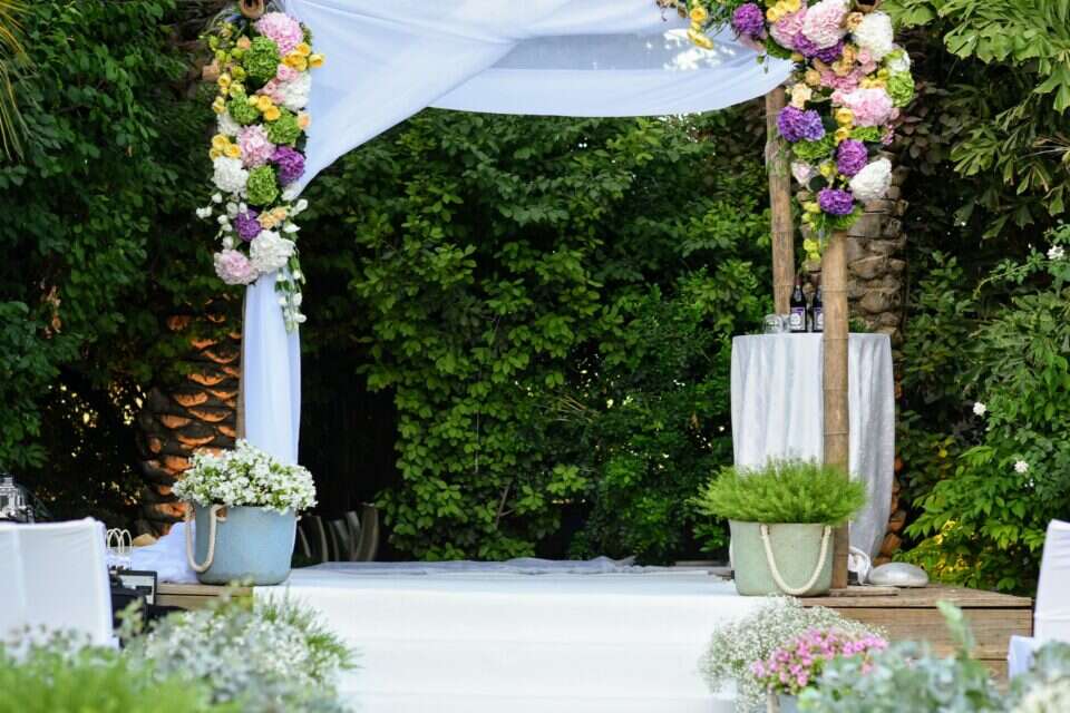 בקצה הגן ממוקמת במת החופה תחת שורת דקלים עצומי קומה, מעוטרת בכילה לבנה ומוארת עם ערב באור נגוהות. מוביל אליה שטיח לבן שמשני צדדיו סידורי פרחים, עמודי תאורה וכיסאות אורחים מכוסים גם הם לבן טהור וחגיגי. אם החלטתם על חופה מוקדמת, ובימות הקיץ על חופה עם רדת החמה - תוכלו לצפות מהגן על השקיעה המרהיבה במערב.