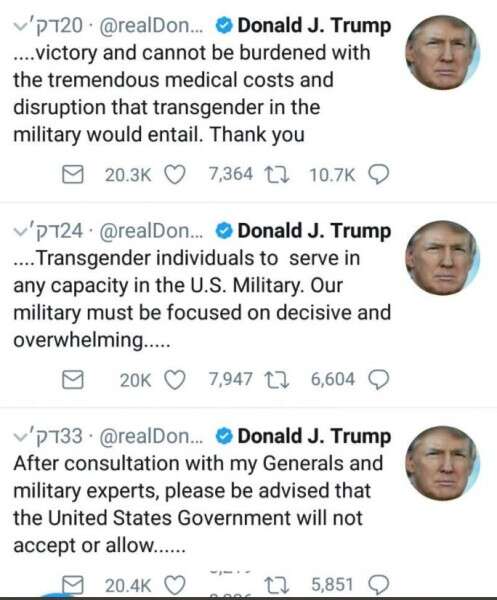 "הממשלה החליטה שלא לאפשר לטרנסג'נדרים לשרת בצבא", כך צייץ היום (רביעי) בטוויטר נשיא ארה"ב דונלד טראמפ, "לאחר התייעצות עם הגנרלים והמומחים הצבאיים שלי, ממשלת ארצות הברית החליטה שלא לאפשר לטרנסג'נדרים לשרת בכל תפקיד בצבא האמריקני".