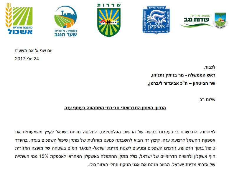במכתב צויין כי: "מדובר במצב אבסורדי בו מדינת ישראל משקיעה משאבים מדיניים וכספיים אדירים בשמירה על בטחון חיי תושבינו בעוד שבו בעת 90,000 קוב של ביוב מעזה, זורם למערכת המים של האזור. כתוצאה מהמצב הזה קרס מתקן ההתפלה באשקלון האחראי לאספקת חמישית ממי השתייה של אזרחי מדינת ישראל".