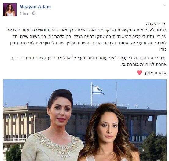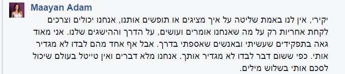לאחר פרסום הדברים, אדם העלתה פוסט תגובה לעמוד הפייסבוק שלה: