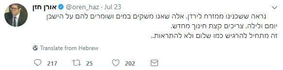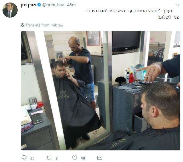 הבוקר העלה ח"כ חזן לחשבון הטוויטר שלו תמונה בה הוא נראה במספרה וכתב: "נערך למפגש הפסגה עם נציג הפרלמנט הירדני. פניי לשלום!". אתמול צייץ חזן כי הוא "נענה להזמנתו של חבר הפרלמנט הירדני לפגישה על הגשר. מחר בעשר בבוקר אגיע לגשר אלנבי לשיחה בגובה העיניים. יש לי הצעה שלא יוכל לסרב לה...".