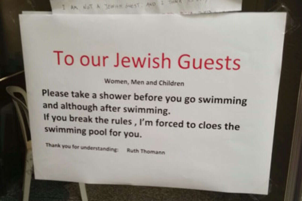 יהודים חרדים רבים מגיעים בתקופה זו של השנה, בה תלמידי בתי הספר החרדים בחופשת הקיץ, לעיירות נופש באירופה. זוג תיירים חרדים שהגיעו לנופש בשוויץ, הופתעו להיתקל בשלט באנגלית בו התבקשו "האורחים היהודים", להיכנס להתקלח לפני שיכנסו לבריכה. לטענתם לא נתלו שלטים דומים עבור בני דתות אחרות.
