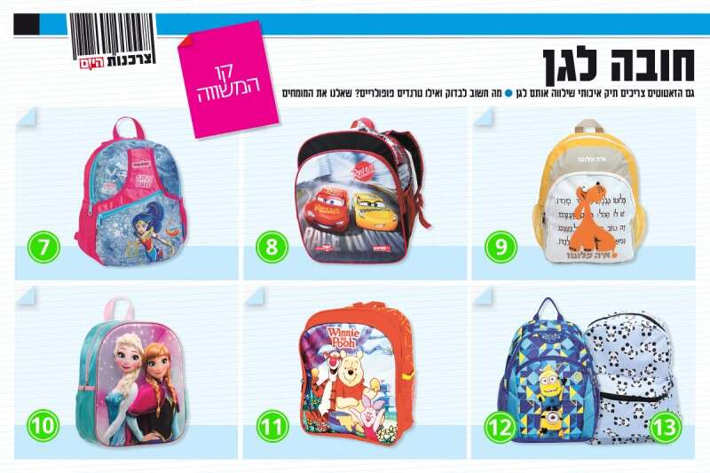 1. איסטפאק, 199.90 ש', 2. אייץ' אנד אם קידס, 89.90 ש', 3. המגדלור, 159 ש', 4. זברה, 29.90 ש', 5. יולו, 79 ש', 6. יו פיקסל 139 ש'