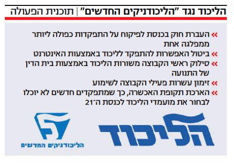 כמו כן, בקרוב יזומנו עשרות פעילים מ"הליכודניקים החדשים" לשימוע במינהלת המפלגה, שבו יובהר להם כי חתימה על טופס המיפקד, שבו הם מצהירים על תמיכה במטרות המפלגה, היא מחייבת - ופעולה נגד הליכוד היא עבירה על החוק.