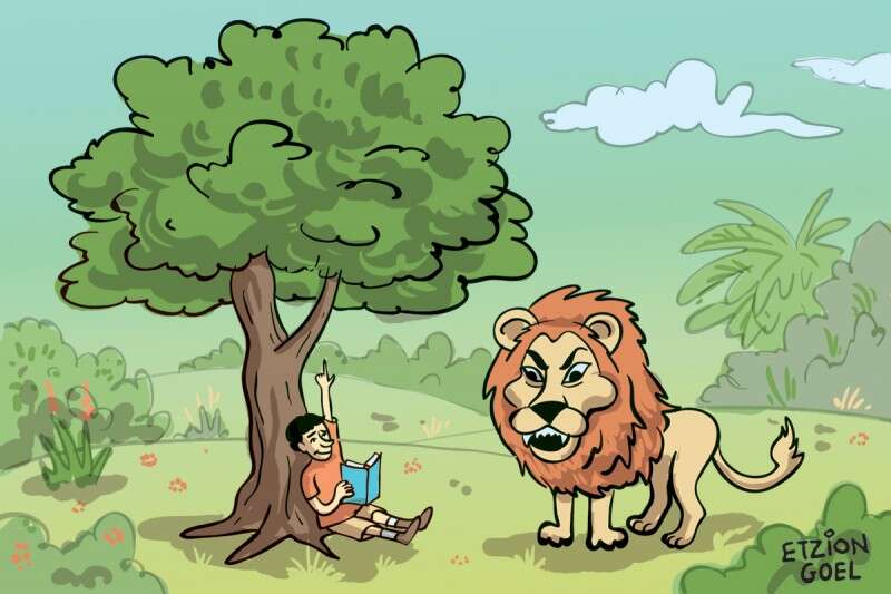 בשלב מסוים מציע צ'ארלי לשבור את הנאחס ולזרוק אבן קטנה על האריה. סתם כדי שיהיה יותר מעניין. נחום, חברו הטוב, קצת מתלבט. אבל צ'ארלי לוקח את הסיכון, והאבן אכן נזרקת. היא אפילו פוגעת, והאריה מתעורר. למען האמת, הוא מתעורר לא טוב. ברגע שהוא מזהה מהיכן עפה עליו האבן, הוא פותח במרדף אריות רעמתני וזועם.