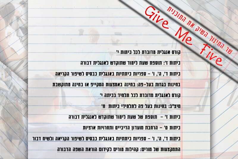 "לא יכול להיות שילדה באופקים לא תדבר אנגלית ברמה של ילד באמסטרדם", כך אמר היום (רביעי) שר החינוך, שהציג את התוכנית ללימודי אנגלית - give me five שתבוא לידי ביטוי בכל מערכת החינוך.