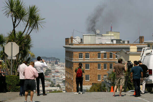 עשן שחור היתמר אמש (שישי) מעל בניין הקונסוליה הרוסית בסן פרנסיסקו, ארה"ב, שעות לפני פינויו הצפוי היום.