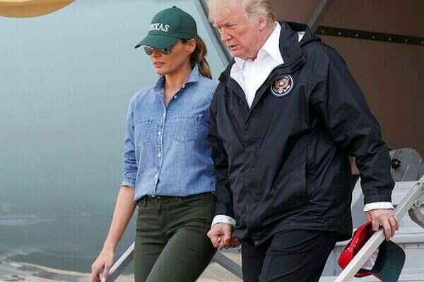 מדובר בביקורו השני של טראמפ בטקסס מאז תחילת הסערה בארצות הברית. טראמפ ירד מהמטוס לבוש במכנסיים כהים ובמעיל גשם. את פניו קיבלו מספר אנשים וביניהם מושל טקסס גרג אבוט וראש עיריית יוסטון סילבסטר טרנר.