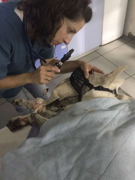 "בהתחלה לא הבנו שהוא פצוע ברגל, חשבתי להעביר אותו לאומנה ללילה אחד אבל בהמשך הבנו שהוא צריך לקבל טיפול רפואי. העברנו אותו לווטרינר, שם התברר כי הכלב סובל מחום גבוה, פצע נשיכה מזוהם, בצקות בקרניות העיניים ושטפי דם בגלגלי העין כתוצאה מהחניקה של שקית האשפה", סיפר עד ראיה ל"תנו לחיות לחיות".