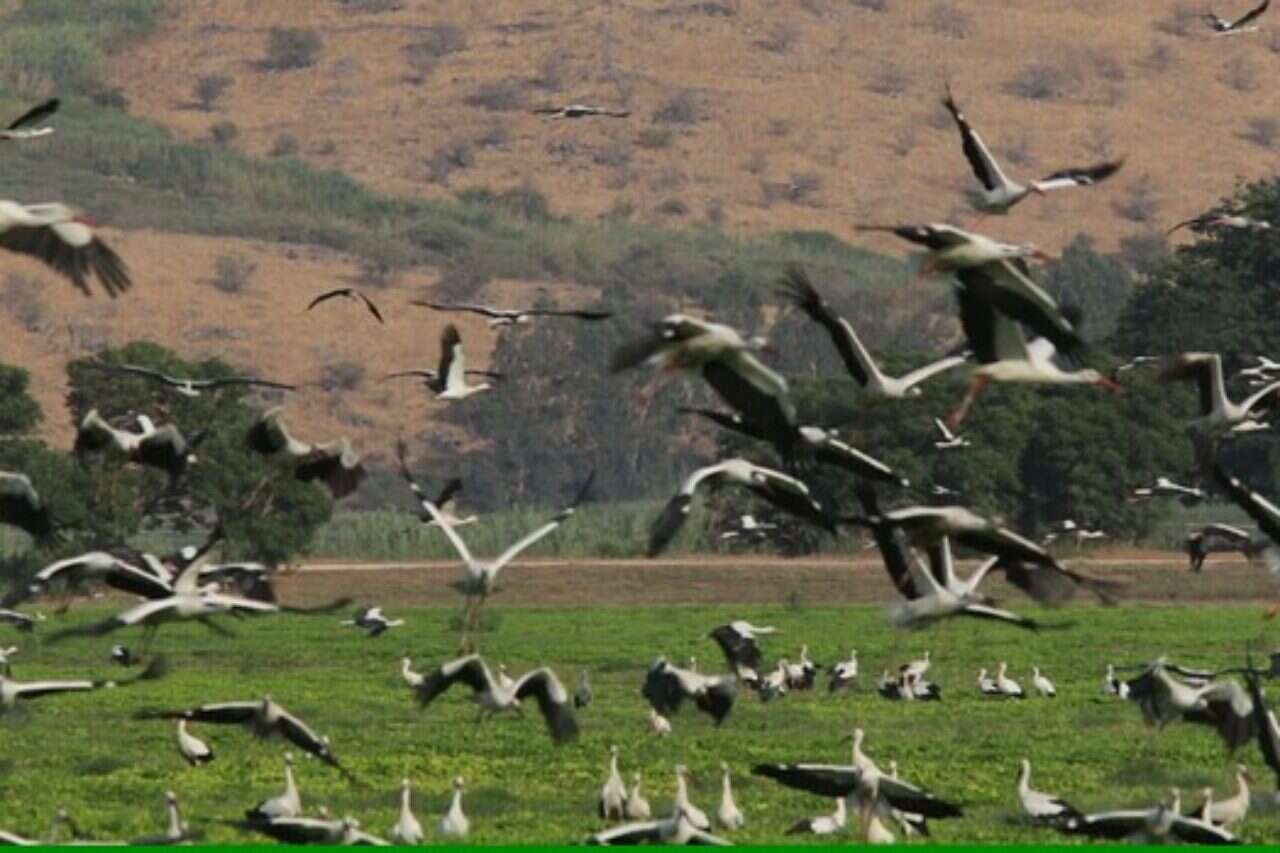מחזה מרהיב הלהיב את המבקרים באגמון החולה: אלפי חסידות נחתו לפנות ערב (ראשון) בשדות הסמוכים לאגמון החולה באמצבע הגליל.