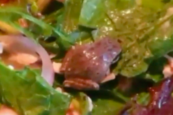 אישה בדרום מדינת קליפורניה, ארה"ב, התכוננה לארוחה שכללה סלט אורגני שהגיע מוכן וארוז בקופסה, ומצאה שם תוספת חלבון ממין שלא ציפתה למצוא, צפרדע קטנטנה.