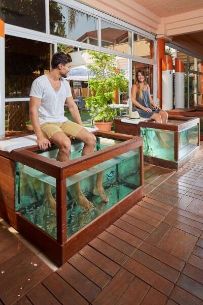 מרבית מרכזי הספא מציעים גם טיפולי מניקור ופדיקור, אבל באחד מהם מצאנו, בין בריכות המים הטרמליים ותפריט העיסויים, גם פדיקור ללא מגע יד אדם. מדובר ב"ספא הדגים", שהגיע לפני שנים מהמזרח ואומץ על ידי "ספא אקויה" שבשדה יואב, הצמוד לחמי יואב. הרעיון, למי שלא נחשף לטיפול עדיין, מבוסס על העובדה שדגיגים קטנים מסוג גרה רופה (GARRA RUFA) אוהבים לזלול עור יבש ומחוספס מכף הרגל האנושית.