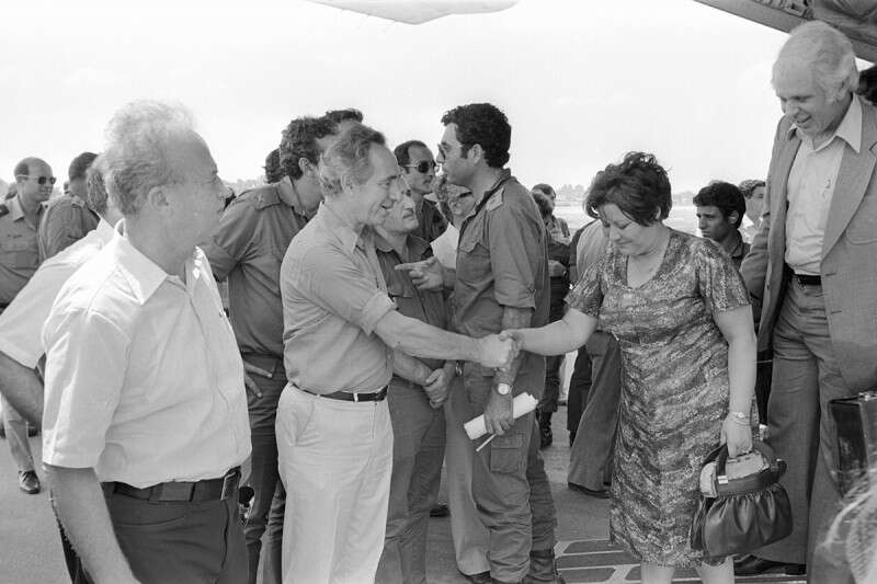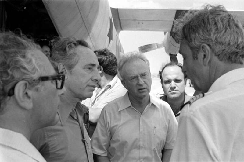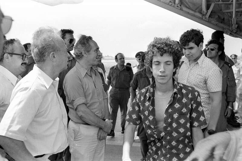 רה"מ יצחק רבין ושר הביטחון שמעון פרס מקבלים את פני החטופים שהחזיר צה"ל מאנטבה שבאוגנדה במבצע "כדור הרעם" /// באדיבות ארכיון צה"ל במשרד הביטחון / צלם: אורי הרצל צחיק