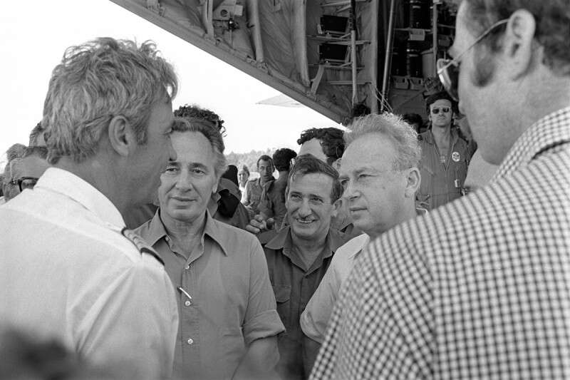 רה"מ יצחק רבין ושר הביטחון שמעון פרס מקבלים את פני קברניט מטוס אייר-פרנס, שמחבלים מהחזית העמית- פלד ודיע חדאד, חטפו לאנטבה שבאוגנדה. בין שניהם מחייך משופם תא"ל אפרים פורן מזכיר צבאי לרה"מ // באדיבות ארכיון צה"ל במשרד הביטחון / צלם: אורי הרצל צחיק