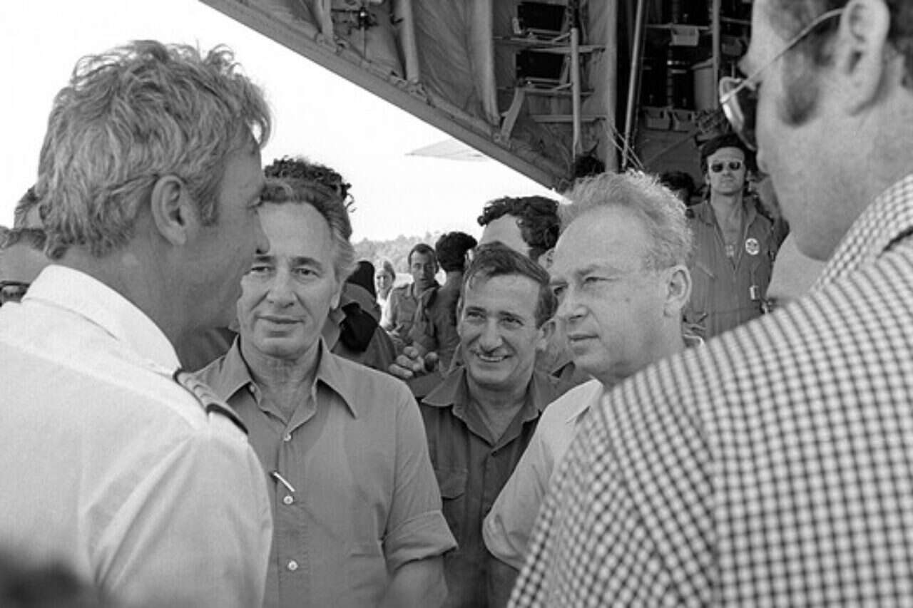 רה"מ יצחק רבין ושר הביטחון שמעון פרס מקבלים את פני קברניט מטוס אייר-פרנס, שמחבלים מהחזית העמית- פלד ודיע חדאד, חטפו לאנטבה שבאוגנדה. בין שניהם מחייך משופם תא"ל אפרים פורן מזכיר צבאי לרה"מ // באדיבות ארכיון צה"ל במשרד הביטחון / צלם: אורי הרצל צחיק
