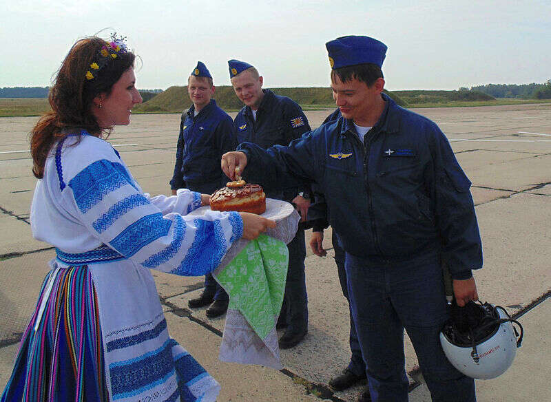 אישה בלארוסית בלבוש מסורתי מקבלת את פני החיילים הרוסים המשתתפים בתרגיל // צילום: אי.פי