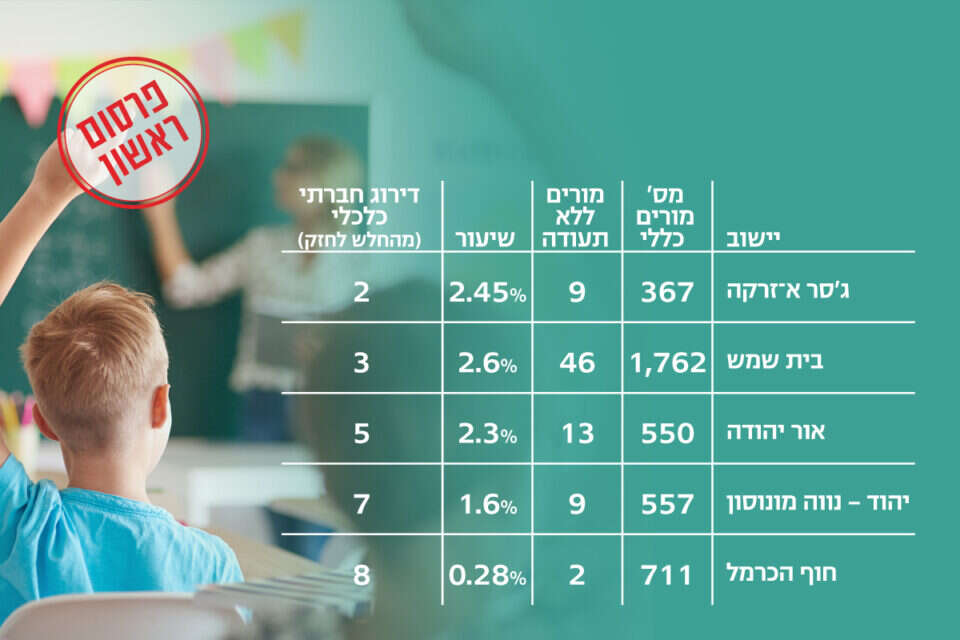 אלא שבהסתכלות על הנתונים עולה ממצא מעניין במיוחד. כאשר משווים בין יישובים מאותו אזור, שהאחד מדורג חברתית־כלכלית במקום גבוה והשני פחות, מספר המורים הלא מקצועיים - ללא תעודת הוראה, בכל שלבי הלימוד: מגן עד על־יסודי - גבוה יותר ביישוב הפחות מבוסס.