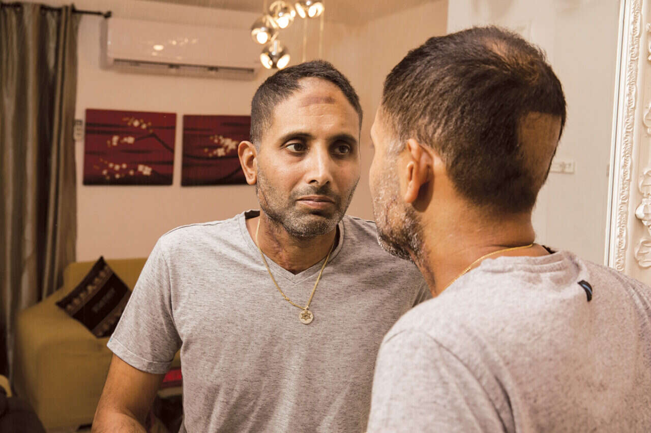 אנחנו נפגשים בשעת ערב בביתו שבקריית עקרון. חודש וחצי בלבד עברו מאז היום ההוא, שבו נדקר 14 פעמים בראשו, בחזהו, בצווארו ובידיו, ונפצע באורח אנוש. גופו חלש וכחוש, מאז הפציעה איבד שבעה קילוגרמים. על מצחו סימן כווייה גדול, שהותיר גז הפלפל שצרב את פניו. שערות ראשו חסרות באזורים שבהם נדקר, ועמוק בראשו, קרוב למוח, עדיין תקוע רסיס מלהב הסכין, באורך שמונה מילימטרים, שהרופאים מעדיפים להשאירו כדי לא לגרום לנזק נוסף. הזקן שעל פניו מסתיר צלקת עמוקה על צווארו.